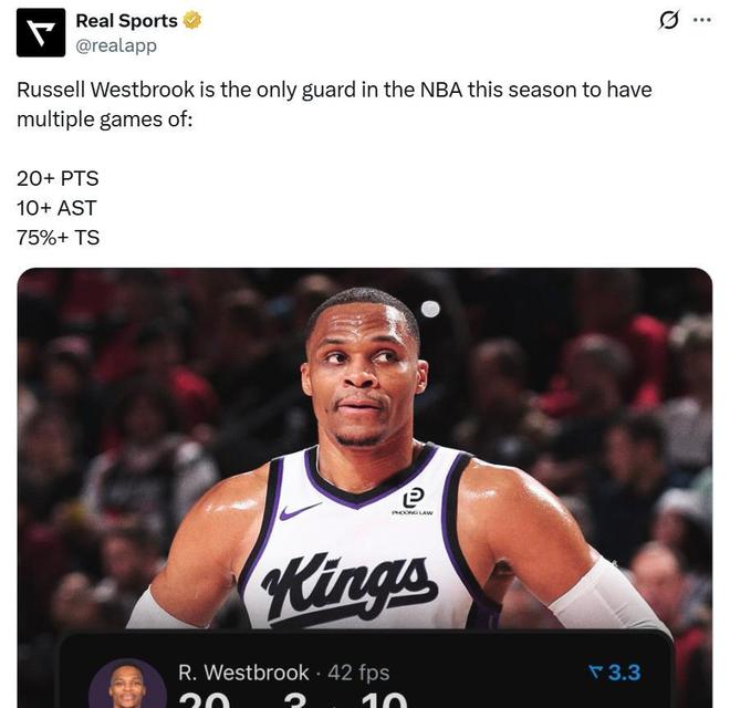 憑借這樣的表現,威少也成為本賽季唯一一名以75%+的真實命中率得到至少20分10助攻的后衛。