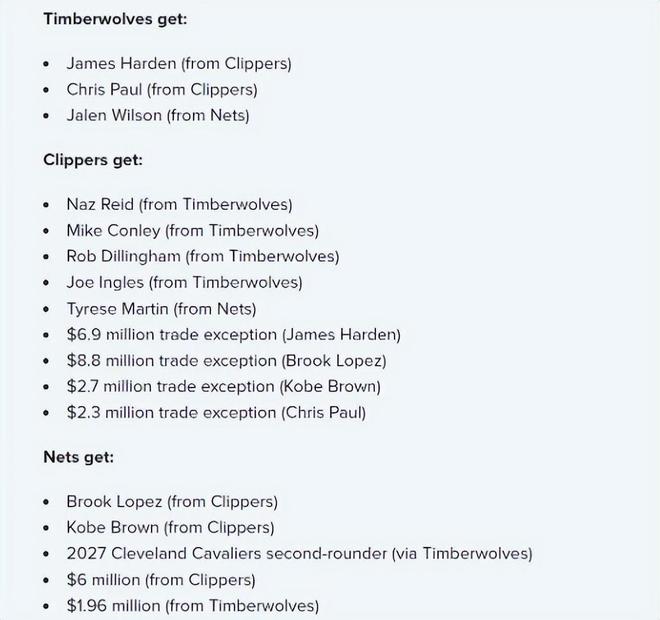 森林狼得到:哈登、保羅以及杰倫-威爾遜;快船隊得到:納茲-里德、邁克-康利、迪林厄姆、英格爾斯、泰瑞斯-馬丁,以及來自哈登的690萬美元交易特例、來自大洛的880萬美元交易特例、來自科比-布朗的270萬美元交易特例以及來自保羅的230萬美元交易特例;籃網隊得到:大洛佩茲、科比-布朗、2027年騎士二輪簽(來自森林狼)、以及快船提供的600萬美元和森林狼提供的196萬美元現金。