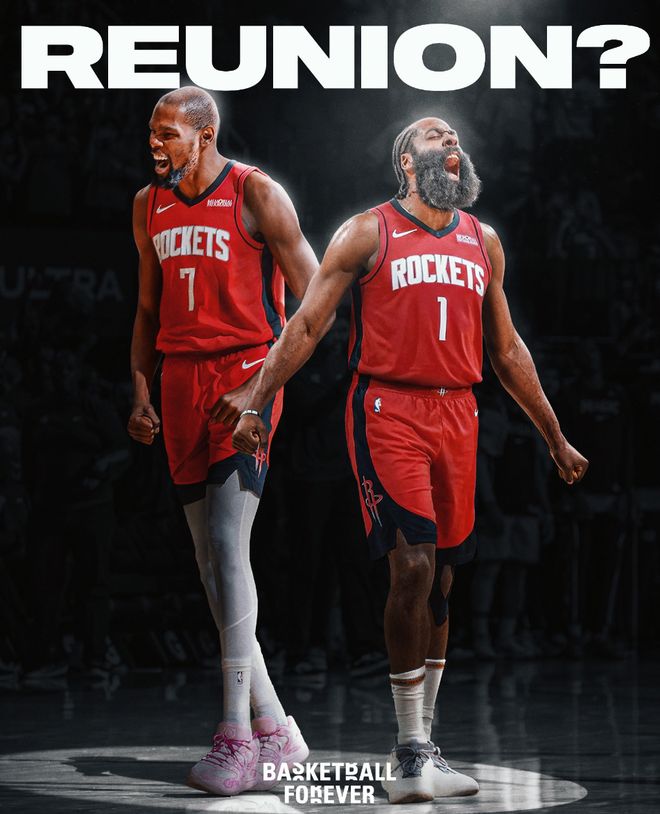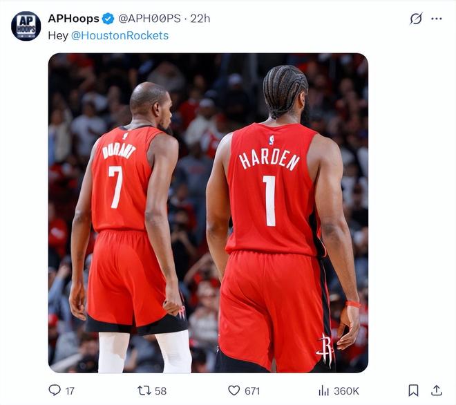 船媒賽后PS了一張杜蘭特、哈登身穿火箭球衣的圖,他還寫道Hey 休斯頓火箭。一天之前他也為騎士隊舉薦了哈登,他真的是為哈登操碎了心。