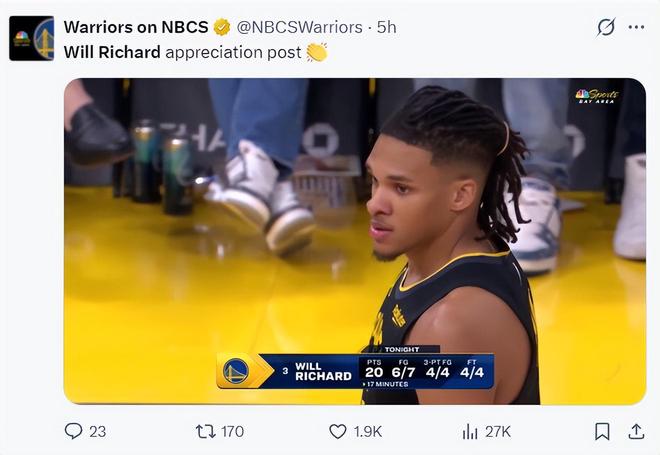就連NBC賽后都為理查德瘋狂打Call,全場比賽理查德19分鐘,7中6,三分4中4,拿到20分5籃板,命中率85.7%,三分命中率100%,真實命中率114.2%,沒錯TS%高達114.2%,這個效率值太高了。