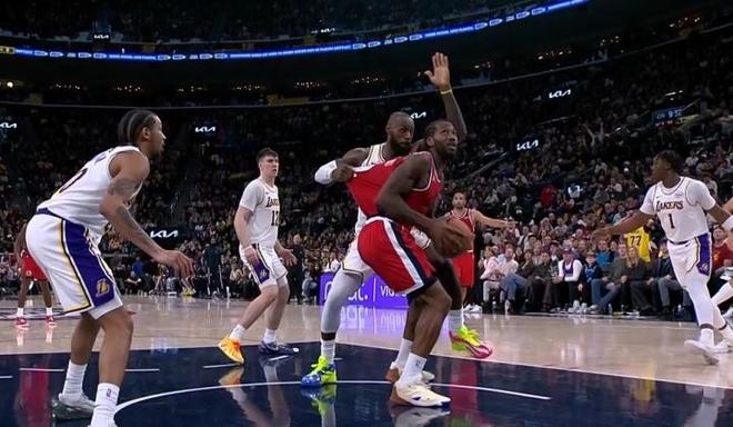 當(dāng)時(shí)這個(gè)回合是第4節(jié)還有9分26秒的時(shí)候,萊昂納德單打詹姆斯,一個(gè)回合里遭遇到了詹皇四次犯規(guī),一拉一切一摟一推,裁判一個(gè)都沒吹。咱們看一下當(dāng)時(shí)的這個(gè)慢動作回放,這個(gè)回合是這樣的,萊昂納德碾著湖人球員殺入籃下上籃不中,自己搶到籃板要二次進(jìn)攻,詹姆斯趕緊沖上來防守。